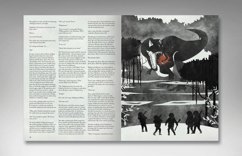 I heavily admire this magazine design spread for the creative use of black, white and grey. Layering different tones and shades of black, these designs have a kind of ink texture to them, paired with dark bold silhouettes and amazing use of negative and blank space I find that this balances the text perfectly not straining or taking away from the readers focus but enhancing it perfectly.
